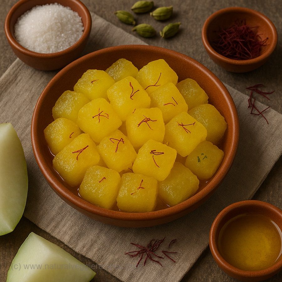 Bring the magical charm of North India to your kitchen with this Angoori Petha recipe, Agra’s signature sweet treat. This delicate, crystalline delight is made from humble ash gourd, lovingly simmered in fragrant saffron syrup and imbued with the subtle note of cardamom. The result is a melt-in-your-mouth candied cube, translucent and glistening, with a gentle chew—the perfect bite to transport you to the bustling lanes of Agra. Unlike traditional milk-based northern desserts, Angoori Petha is totally unique, created by soaking and cooking winter melon before slow-candied transformation in saffron-laced syrup.